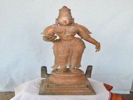 | Description / विवरण | Standing on the padma peetam in Tribhanga posture with two hands. Right hand in kataka mutra while the left hand in lola hastha pose. Wearing kirita makutam. Waist dress is highly decorative and extended up to the feet. |