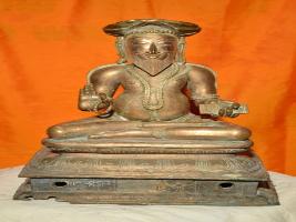 | Description / विवरण | Seated on padma peetam with Padmasana pose. Having two hands. The right hand with Vyagna mutra with rudraksha bead garland and the left hand with a palm leaf manuscript. Long ornament decorated on the chest. Long ears. The face is with beard. The head adorned with flat hair dress. |