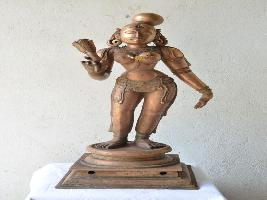 | Description / विवरण | Standing on padma peetam in Tribhanga style with two hands. Right holding a flower and the left in lola hastha pose. Bun shaped hair dress on the head. Ornamented long ears. |