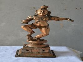 | Description / विवरण | Dancing on padma peetam with the right leg rests on a flower. Two hands. Right hand hold butter ball and left hand in dancing posture. Bun shaped hair dress decorated on the head. As a small chil, nude and wearing bell garlang in the waist. |