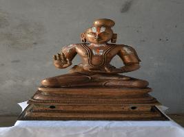 | Description / विवरण | Seated on the padma peetam with padma sana. Two hands. Right hand in Abhaya and left hand in Dyana mudras. Bun shaped hair dress. Long double rudraksha mala on the chest. |