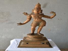 | Description / विवरण | Standing on padma peetam in Tribhanga style. Two hands are in the posture of holding a bow. But, the bow is missing. Wearing kirita makuta. Basket to hold the arrows tied to the back of his right shoulder. Lower garments upto knee. |