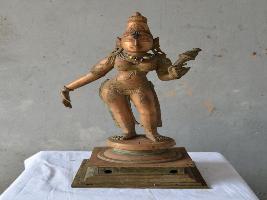 | Description / विवरण | Standing on padma peetam in Tribhanga style with two hands. Left holds a flower and the right in lola hastha pose. Wearing kirita makuta. Lower garments. |