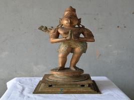 | Description / विवरण | Standing on padma peetam in Tribhanga style with two hands in Anjali hastha pose. Wearing kirita makuta. Arrow basket at his back right shoulder. Lower garments upto knee. |