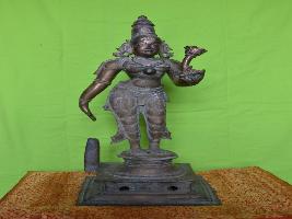 | Description / विवरण | Standing on padma peetam in Tribhanga style with two hands. Left hand holds a flower and the right hand in lola hastha pose. Wearing karanta makutam. Ornamented ears. Brest covered with katchai. Lower garments. |