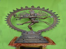 | Description / विवरण | Dancing on Apasmara over padma peetam. Four hands. Upper hands carry damaru and fire. Lower hands are in Abhaya and gaja hastha mudra. Five hair locks on either side. Tiruvasi is decotaed with 31 flame motifs. |