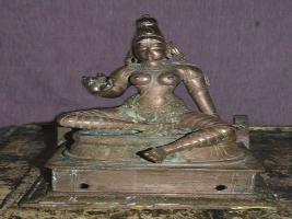 | Description / विवरण | Sitting on the padma peetam with right leg folded and the left leg in hanging position. Having two hands. Right hand in kataka mutra while the left hand is placed on the peetam. Makara kuntalam on the ears. Devoid of kujha bhandam. Wearing jata makutam on the head. |