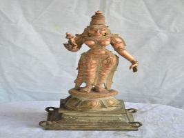 | Description / विवरण | Standing on padma peetam in tri bhanga pose with two hands. The right hand holds a flower while the left hand in lola hastha posture. Devoid of kujha bhandam. Wearing karanta makutam on the head. |
