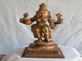 | Description / विवरण | Standing on padma peetam with four hands. The upper hands are with Ankusa and pasa. Lower hands are in Abhaya and Varadha poses. Devoid of kujha bhandam. Wearing jata makutam on the head. |