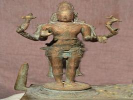 | Description / विवरण | Standing on padma peetam over a rectangular pedestal along with Uma. Having four hands. The upper hands are with an axe and deer. The lower hands are with Abhaya and Varadha pose. Makara kuntalam on the ears. Wearing jata makutam on the head. The waist band is decorative and waist dress is extended up to thigh. |