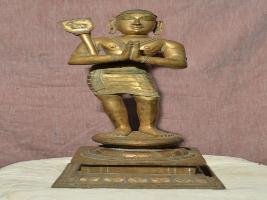 | Description / विवरण | Standing on padma peetam with folded hands in Anjali hastha pose. Uzhavaram with a bull emblem is on the right shoulder. Long ears. Wearing Rudraksha garland on the head. |