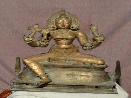 | Description / विवरण | Sitting on padma peetam with four hands. The upper hands are with Damaru and pasam. Lower hands are with Trisule and kapala. Broad eyes. Pathra kuntalam on the ears. Wearing jwala makuta on the head. Kujha bhandam is present. |