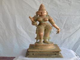 | Description / विवरण | Standing on padma peetam in Tribhanga posture with two hands. The right hand holding a flower while the left hand in lola hastha pose. Kujha bhandam is absent. Wearing karanta makutam on the head. Waist dress extended up to the feet. |