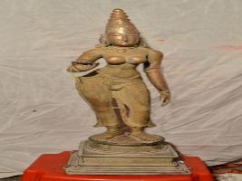 | Description / विवरण | Standing on padma peetam in Tribhanga pose. Two hands. Right hand in kataka mutra and left hand in lola hastha pose. Kujabhandam is absent. Karanda makutam is on the head. Waist dress is extended up to the feet. |