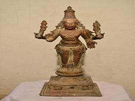 | Description / विवरण | Standing on padma peetam with four hands. The upper hands carry Sakthi and Vajram. Lower hands are with Abhaya and Varadha poses. Channa vira is on the chest. Wearing kirita makutam on the head. |