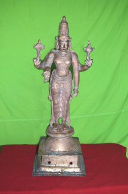 | Description / विवरण | Standing on a pedestal. Having 4 hands. The Upper two hold sanku and chakra Lower two hands in varada and Katyavalambita posture. |