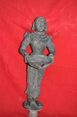 | Description / विवरण | Lady standing in samabanga posture with a lamp on her two hands. Wearing full dress; necklaces on the neck. Hair dress is shown beautifully with flower decoration on the back side. |