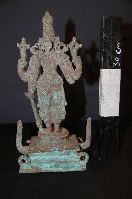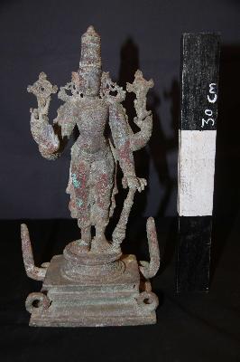 | Description / विवरण | Vishnu is shown in a standing posture on a lotus pedestal with four hands. He holds a chakra in his upper right hand and a sankha in his upper left hand. His right hand is in Abhaya mudra and the left hand holds a mace. He is adorned with makuta, makara kundala, ornaments and a lower attire. Four rings and two rods are attached to the pedestal. |