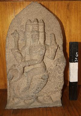 | Description / विवरण | Brahma is shown with three heads and four hands. He is raiding a swan. The swam is standing on a small pedestal. He holds a ladle in the upper right hand and a book in the upper left hand. His lower right hand is shown in abhaya mudra and the left is shown holding the rope. He is shown with a long moustache and a beard. He is adorned with makuta, ornaments and lower garment. |