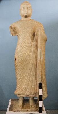 | Description / विवरण | It is a life-size image of Buddha. It is modelled in a round and far from slenderness. Both hands are broken. The left shoulder and forearm are draped in samghati and the right hand is missing. A part of his left hand holds the hem of the robe near his chest. A circular mark called urna, a mahapurusha laksana is seen on Buddha s forehead. The head of Buddha is found with a top knot and ring-like curls of short hair turned to the right (daksinavartta-kesa) suggestive of superhuman wisdom. The figure is treated with red ochre |