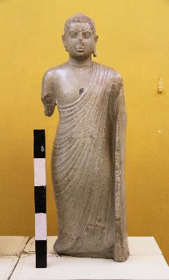 | Description / विवरण | Buddha is shown standing in the sculpture. His both hands and legs are broken. The left shoulder and left hand are covered with saṁghāti. The head is seen with curly rig-like hairs, a chipped-off nose, an ūrṇa mark and an elongated ear. The figure is mended at its lower part. |