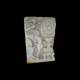 | Description / विवरण | The Dome slab fragment shows the worship of the Dharma Chakra, placed on a pillar, throne and padukas by a fly whisk-beared and a seated devotee. A flying celestial being is depicted above. An inscription is engraved in a line at the bottom. |