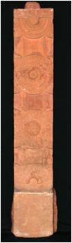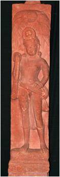 A royal Buddhist devotee is depicted with a long garland in his right hand, standing, on a jewelled thrown. The devotee is shown wearing dhoti. His left hand rests on the waist. He is wearing ornaments his head. He is standing under a sala tree. The back view is decorated with lotus medalls two full two half.