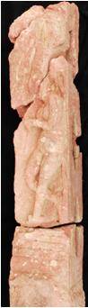 A lady is standing under a tree on a wall. She is standing cross- legged. Her right leg is bent touching tree truk, whereas the left leg is firmly placed on the wall. Her head is bent forwards right. She is holding something broken on her left hand which is bent towards right side. Portion of bangle is visible on her left hand in transparent dhoti. On left side is visible portion of girdle. Back side is decorated with four lotus medallions.