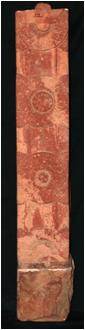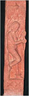The standing lady is shown resting against the Asoka tree. Her right leg is bent the sole of anklet touches the base of the stem. She is ornamented with nupura, Kankana, valaya, ekavati, mekhala kundala. The hair are arranged like semi-circle on her forehead which is centred in the centre combed in the form of two leaves. The rest of the hair is combed allow to hang freely on the back. The lady is wearing a thin sari, has rolled the upper portion of sari thrown it across a branch of tree. The sari is folded over the let arm the lady is pulling the branch of tree in her two hands. She stands on a square flower pedestal. The back of the pillar is decorated by lotus medallions.