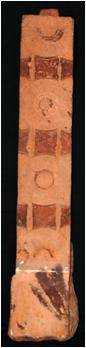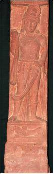 The pillar contains the standing figure of a royal devotee on a cushion holding a long garland of flowers in his bent raised right hand while his left hand is in akimbo posture. The front pleat of this diaphonous dhoti is clearly visible in between two legs reaching upto the foot. The dhoti is tied tightly on h is waist. The figure is shown having broad chest, strong arm. It is ornamented with kankana, keyura, kanthi, kundala. It wears a crown designed like a flower. The figure represents a smiling face. The cushion on which it stands have the depiction of lion figure. The fold of the uttariya is hold by the left hand. A roofed balcony with front railing is seen above the figure. The backside has the design of lotus medallion in buff colour.