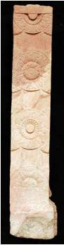 A lady is depicted standing on a cushion under a balcony. The lady is trying to adjust her necklace around her neck with her right hand. Her left hand is on her waist holding her girdle. She has attired herself with kundalas, bangles, anklets. The fold of her dhoti garment are hanging on her right side. She has been depicted in transparent dress. the back side is decorated with lotus medallions, two full and two half.