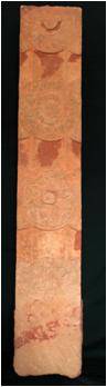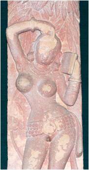 A female is standing cross-legged under a sala tree over a platform, on which is carved a queer creature having crocodile's mouth the back of a fish. Her left foot is placed firmly on the crocodile while the toe of right foot is touching the back of the animal. This lady is shown with a rectangular mirror is her left hand setting her bindi on the forehead. She has been decorated with various ornaments. On the back side of this pillar are carved two full two half-lotus medallions. A tenon is also visible on the top.