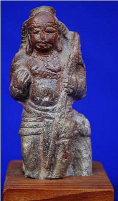 | Description / विवरण | The standing figure of a human holding a long spear like object in his left hand and his right hand is bent and rests on right portion of chest. It wears a dhoti. One cloth is tied at waist and the end of it is hanging at his left side. Its head is covered by cloth at back. |