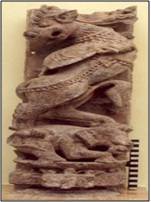 | Description / विवरण | The stylized mythical lion vyala stands of its kind legs over the elephant and fantastically twists its body to look backwards. Its tail curls between the legs and paws are placed in front of the chest. A long tongue protrudes from its open mouth. It has horns, mustache and bulging eyes. |