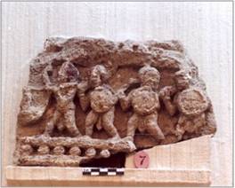 | Description / विवरण | Sculptural fragment depicting a figure carrying the one end of a palanquin, the other end being broken and followed by three infantries holding sword and shields in their hands. |
