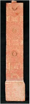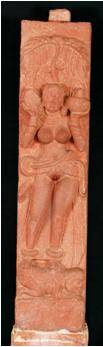 The pillars depicts the standing lady on a bent vama yaksha under a Asoka tree holding a wine flask and a elliptical half damaged unidentified object on her bent raised left right hand respectively. She is bejewelled with heavy ear stud ekavali , necklace, numerous bangles with kankana, heavy nupura. She is draped herself by transparent lower garment. Her mekhala is hidden by the rolled up upper garment or one end of dhoti which is tied round her waist knotted above her hip. She has parted her hair in leaf shape in front centre portion rest of the hair is combed simply. The back side of the pillar is decorated by lotus medallion. The wine flask contains flower design in regular interval.