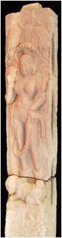 A lady is standing under a tree on a dwarf in kneeling position depicted in this panel. She is holding a chowri fly whisk in her bent right hand. Diaphanous mark shows her transparent garment. She is wearing kundalas, necklace, bangles, girdle, anklets two full two half lotus mediallions at the back side.