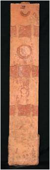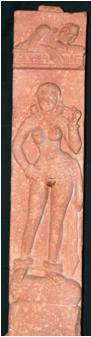 In this pillar a lady is depicted standing on a cushion holding the lock of her hair in her left hand the right hand is on the waist. This is depiction of nishabhisarika whose description has been found is kalidas's 'Meghaduta'. She is standing on a cushion. The cushion has been designed with a straight band with dots in it. In the upper portion a male figure is depicted in reclining position on a balcony.