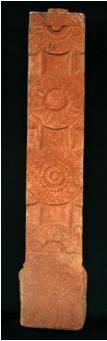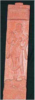 A lady is standing firmly on a dwarf crawling towards her right hand side. The lady is holding a long garland in her right hand bent raised to the level of the shoulder level of the shoulder. The lady is wearing diaphanous drapery. The garment falling gracefully on the left of the body coming over her left shoulder. The lady is decorated with ornaments. A balcony with railing in front, two doors windows is visible.