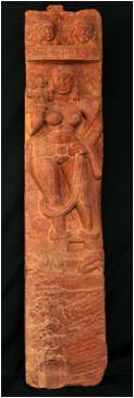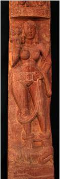 A lady is shown here standing on a dwarf under a balcony, holding a lotus stalk in her right hand. The hand is placed on the waist. In the balcony two figures are shown. Lotus medallion at the back side of the pillar.