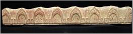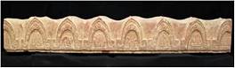 Fragment of a coping stone containg total sixteen semi-circular niches on both faces enclosed within two arched molding resembling bamboos. The niches contains auspicious symbols. Front Face - A - Architectural pattern probably elevation of a stupa. In front of the gate inverted lotuses are shown from which gems are seen falling on ground. B - As in A C- Nagapuspa honey suckle motif. D- Floral motif. E - Pair of fish suspended from the lower handle of the lotus parasol Padmapatra F - Architectural pattern. G - Tilted purnaghata with a lid. H - Window vatayana broken Back Face - A- Architectural pattern stupa is broken B - floral motif. C - Sankha padma D - Maladam Garland in a leave container . E - Srivatsa F - Architectural pattern stupa G - Srivatsa of a variant type. H - Architectural pattern stupa .