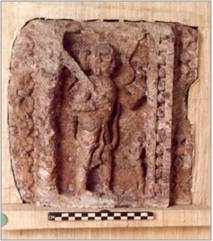 | Description / विवरण | The sculptural fragment within beaded borders depicts a standing male figurine holding a sword in his right hand. In front of him stands a dwarfish figure with folded hands. |