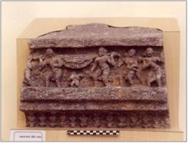 | Description / विवरण | The sculptural fragment depicts two bearers carrying a palinque like object on their shoulders below which is depicted a dwarfish figure and followed by two chari-bearer female attendants. |