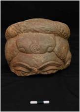 | Description / विवरण | This is a fragmentary of a male head, portion above eyes . Above his forehead is visible hairline. On top of his head, his hair is tied in a way forming a ring. A wheel like design is visible on the middle of his forehead. |