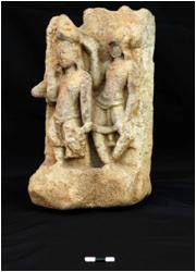 The fragmentary portion of the panel shows two standing human figures. The sculpture is highly mutilated that s why details are not clearly visible .