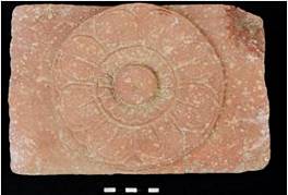 | Description / विवरण | Side A- An 8 petalled lotus design. The whorls of the flower are shown in four levels. The lower most level is the calyx whose sepals can be seen in between the spatulate petals of the corolla of the nose level above. The inner concentric circle represent third level consisting the androcium. The fouth or topmost level is the middle disc which represents the gynocium. The ovaries are marked by four tiny circles. Side B- An 8 petalled lotus design consisting three levels. The lowest level is plain. In the second level 8 pointed petals are show. In the third level the disc or top shows four another lobes. The stigmas of gynocium or pistil is shown in the form of cross, each tiny division in the cross representing a stigma. |