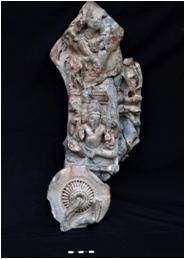 | Description / विवरण | The fragmentary panel shows a Sudarsana Chakra at lower portion and two remaining leg is visible near it. Above the chakra lord Brahma is in seated position. Out of its four hands the right upper hand holds some unidentified object, right lower hand is in Abhaya Mudra holds rosary. The left upper hand is broken left lower hand holds unidentified object probably veena . The yajnopavita is prominently visible. Just above Brahma one attendant is visible above it a female figure is visible but the head is broken. |