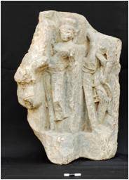 | Description / विवरण | The sculpture shows two male figures one female figure in between them. The head of first male figure as well as from the thigh portion is broken, only the body portion with the right hand is remaining it appears that it holds some musical instrument. The head of the third figure is also broken. His left leg is slightly bent. The middle figure of lady is shown tilted towards left and her left leg is bent. Her chanavira necklace is clearly visible. She has rolled her hair on top tied it. |