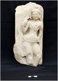 | Description / विवरण | The sculpture contains the standing figure of a lady. Her left leg is bent she is tilted towards left. She holds some object in her right hand her left hand rests on the waist. She is adorned with kundala, necklace graceful mekhala. She is shown with very profusely carved hair style. She simply combed her hair is tied in top with a ribbon. |
