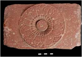Side A- 8 petalled lotus design having four levels. I - The calyx with its sepals in the shape of rhombus. II - The corolla with broad petals. III - The ardroecium with its filaments. IV - Anther lobes gynoecium are seem. Side B- Twelve petalled lotus design having,three levels. I- Twelvepetals II - One large disc representing adnroecium. III- One disc representing gynoecium.